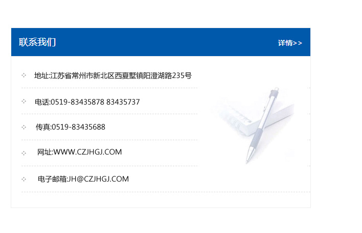地址:常州市新北區友邦商務大廈1幢16、17層  電話:0519-85101652  傳真:0519-85112595  郵編:213022  網址:www.cz-jiayue_cn.youjiexun.com  郵箱:xiajifengaa@163.com